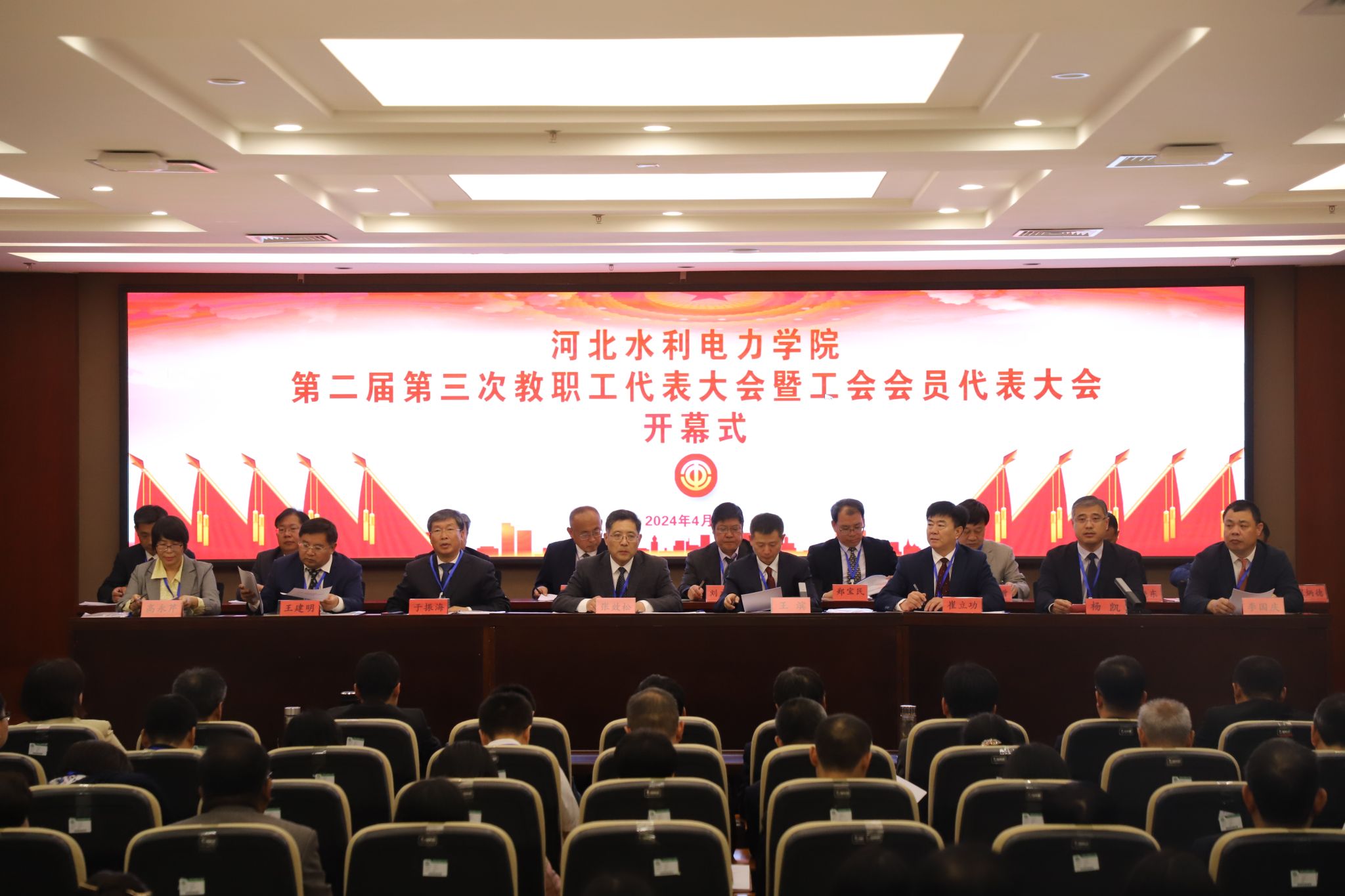 4月25日上午8:30,在雄壮的国歌声中,我校第二届第三次教职工代表大会暨工会会员代表大会在弘文•守正楼九楼报告厅召开。党委书记张效松,党委副书记、校长王滨,副校长于振海、崔立功、王建明、杨凯出席,开闭幕式由杨凯主持。来自学校不同岗位的正式代表和列席代表共105人参加了会议。开幕式上,党委副书记、校长王滨以《坚定信心抢抓机遇 实干担当踔厉奋发 全力谱写应用型本科院校高质量发展新篇章》为题作工作报告。报告指出,...