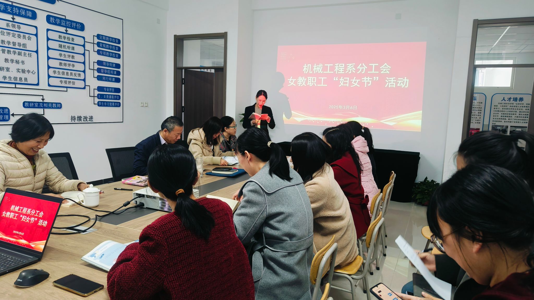 在第115个“三八”国际妇女节来临之际,机械工程系分工会于3月6日下午举办了“书香三八”读书朗诵活动,丰富女教职工精神文化生活。活动伊始,机械工程系党委书记路维和主任张铁壁分别向全体女教职工致以节日的问候和美好的祝福,充分肯定了女教职工在系部发展建设中做出的重要贡献,并鼓励大家继续发扬“自尊、自信、自立、自强”的精神,立足岗位,建功立业,为系部发展再立新功。随后,教师代表依次登台,深情朗诵了《致橡树》《...