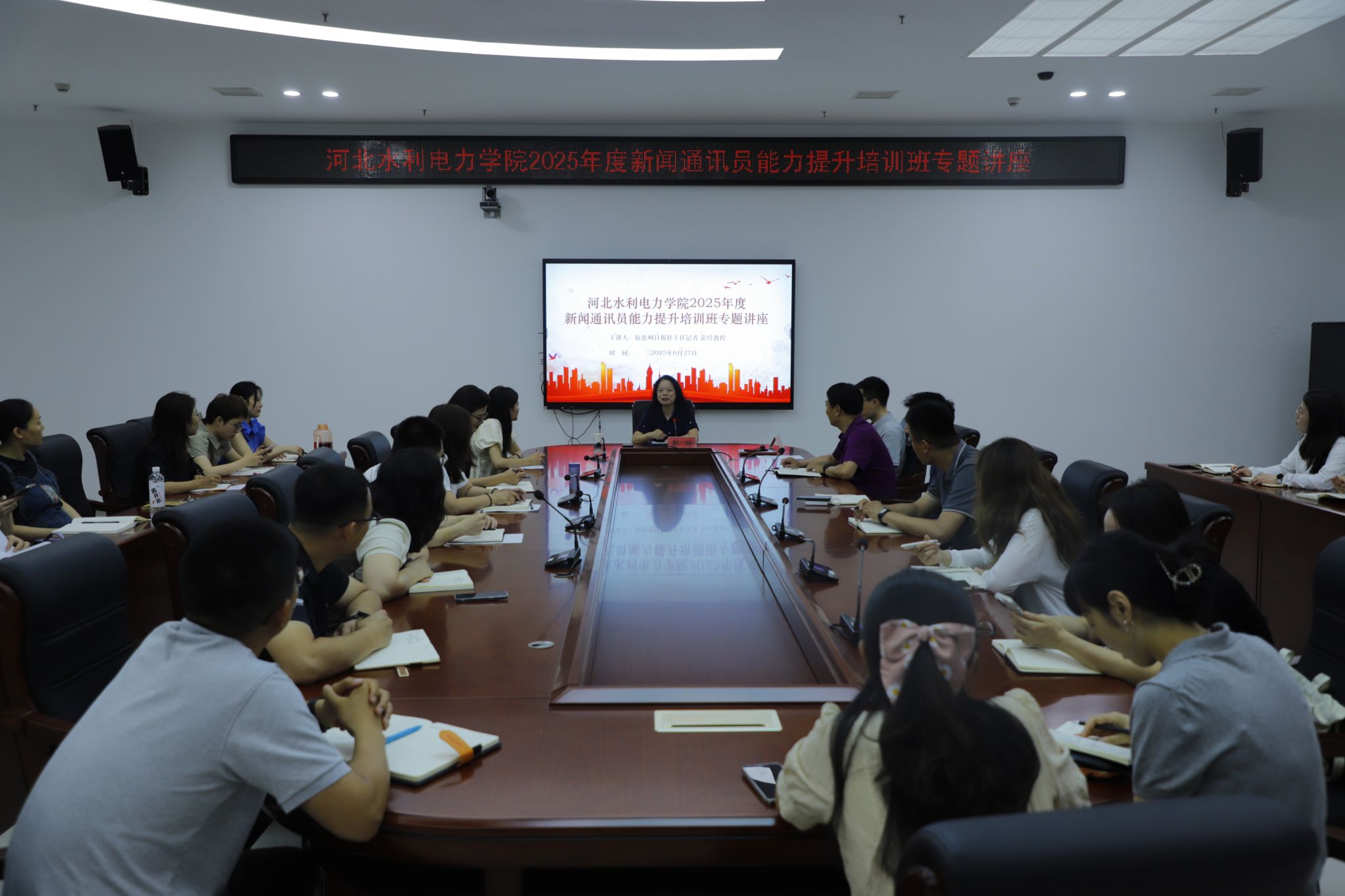 4天时间、2场线下讲座、8次热烈掌声、560分钟线上学习…6月27日-30日,我校党委宣传部在弘文守正楼9楼第三会议室举办2025年新闻通讯员能力提升培训班,培训班分为线下集中培训和线上课程学习两个环节,旨在通过理论与实践相结合的模式,进一步提高全校各中层单位新闻通讯员的媒介素养和新闻写作能力。本次培训特邀沧州日报社原主任记者彭玲与沧州师范学院新闻学副教授李杰担任主讲。彭玲结合二十余年的从业经历,深入浅出地讲解了文字工作的内涵以及新闻写作的标准、...