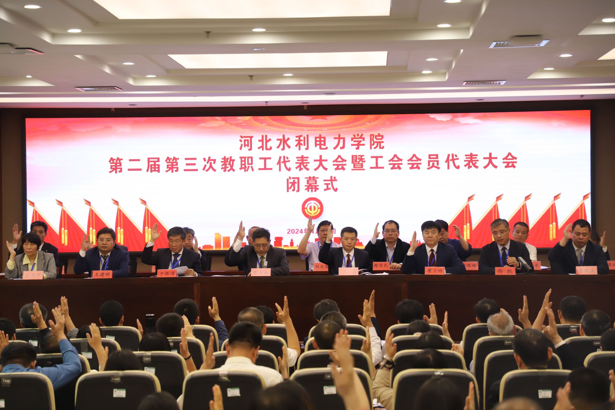 下午15:30,大会进行第二次全体会议暨闭幕式,全体代表一致表决通过了《学校工作报告》《财务工作报告》《工会工作报告》《提案工作报告》《工会经费审查工作报告》五项决议。最后,党委书记张效松致闭幕词,他首先代表学校党委向大会圆满成功表示祝贺,向各位代表和为大会服务的工作人员表示感谢和慰问。