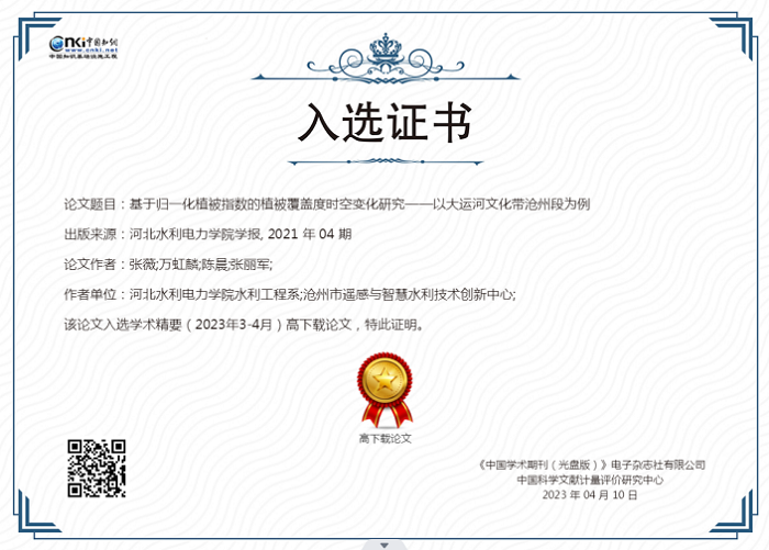 近日,中国知网《学术精要数据库》基于中国知网资源总库,首次发布近12年来高影响力论文榜单,《开云集团(kaiyun)股份有限公司官网学报》2021年第4期发表的《基于归一化植被指数的植被覆盖度时空变化研究——以大运河文化带沧州段为例》(作者:张薇、万虹麟、陈晨、张丽军)、《人脸识别的智能防疫系统设计》(作者:王继超、张丽娟、尤田、孙东来、回振桥)2篇论文入选。