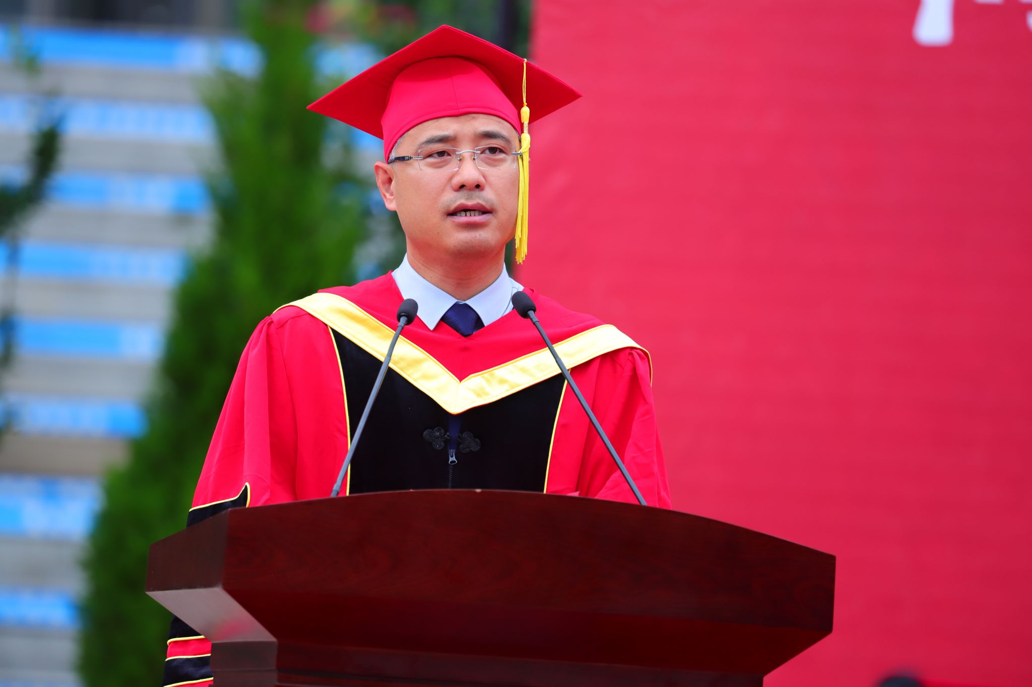典礼上,党委副书记、校长王滨以《菁菁水院绽芳华 乘势扬帆启新程》为题发表了热情洋溢的讲话。他代表学校向2685名2025届毕业生圆满完成学业表示热烈的祝贺,回顾了毕业生们在校期间的点点滴滴,肯定了大家的努力与进步,并从“一是你我向上,家国向前——希望你们永远胸怀家国,将个人奋斗汇入时代洪流。二是学而不止,行以致远——希望你们永远勤学不怠,在社会大课堂求知探源。三是百舸争流,奋楫者先——希望你们永远砥砺奋斗,在时代最前沿百炼成钢。”等三个方面对毕业生们提出了殷切期望和谆谆教诲,希望毕业生们在变革的时代把握好人生前行的方向,既要仰望星空、志存高远,把爱国之情、报国之志与个人理想抱负紧密结合,在服务国家发展和人民福祉的实践中彰显青春风采、贡献青春力量;也要脚踏实地、行稳致远,保持乐观积极、包容豁达的心态,勇于做困难而真正有价值的事,不过分在意一时之快慢、一事之成败,坚持在运动中保持健康、在阅读中丰盈内心、在交流中拓宽视野,以美好自我创造出更加美好的未来。