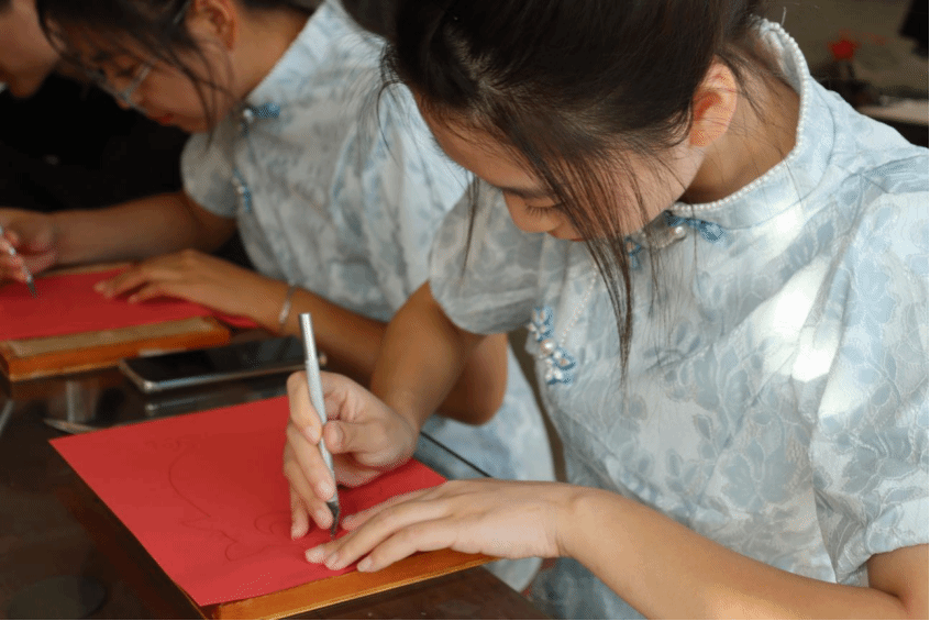刻纸艺术源于剪纸而精于剪纸,有单色和彩色以及阴、阳刻之分。竹刻则是以刀代笔,在竹子上刻制书画等作品。2012年,刻纸和竹刻艺术被列入市级非物质文化遗产名录。“要完成一幅刻纸作品,比创作一幅工笔画还要复杂。首先,我们要将构思好的画稿画在硫酸纸上,接着把宣纸和画稿装订在一起,再把订好的画稿放在蜡板上,用特制的刻刀沿线条轮廓刻出来。因此,也需要有扎实的绘画功底”马振领说。同学们认真观摩学习,本次非遗活动不仅提升了大家对刻纸技术的兴趣,也让同学们对其有了更加深刻的了解与认识。乐道拾遗,匠心铸遗,使同学们能够将专业学习与文化传承相结合,深度体验璀璨夺目的非物质文化遗产艺术,在艺术中接受熏陶洗礼,在美育中体悟家国情怀。