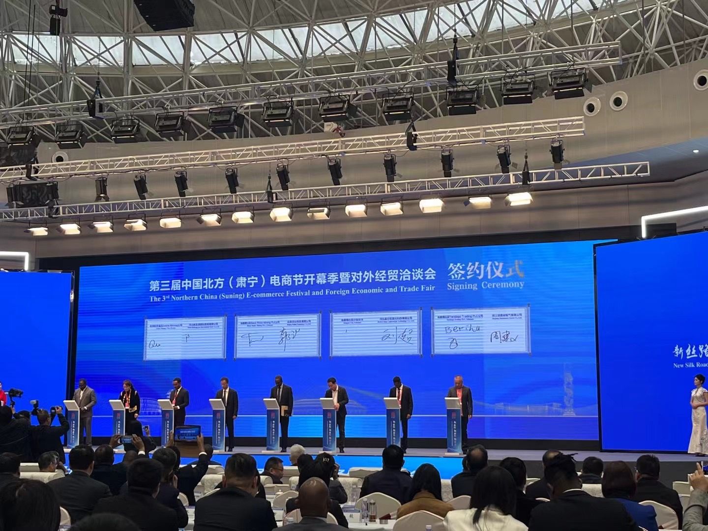 11月3日,我校经济贸易系董辉、王梦、高晶和基础部苏畅四位教师受肃宁县人民政府邀请,参加了第三届中国北方(肃宁)电商节开幕季暨对外经贸洽谈会。