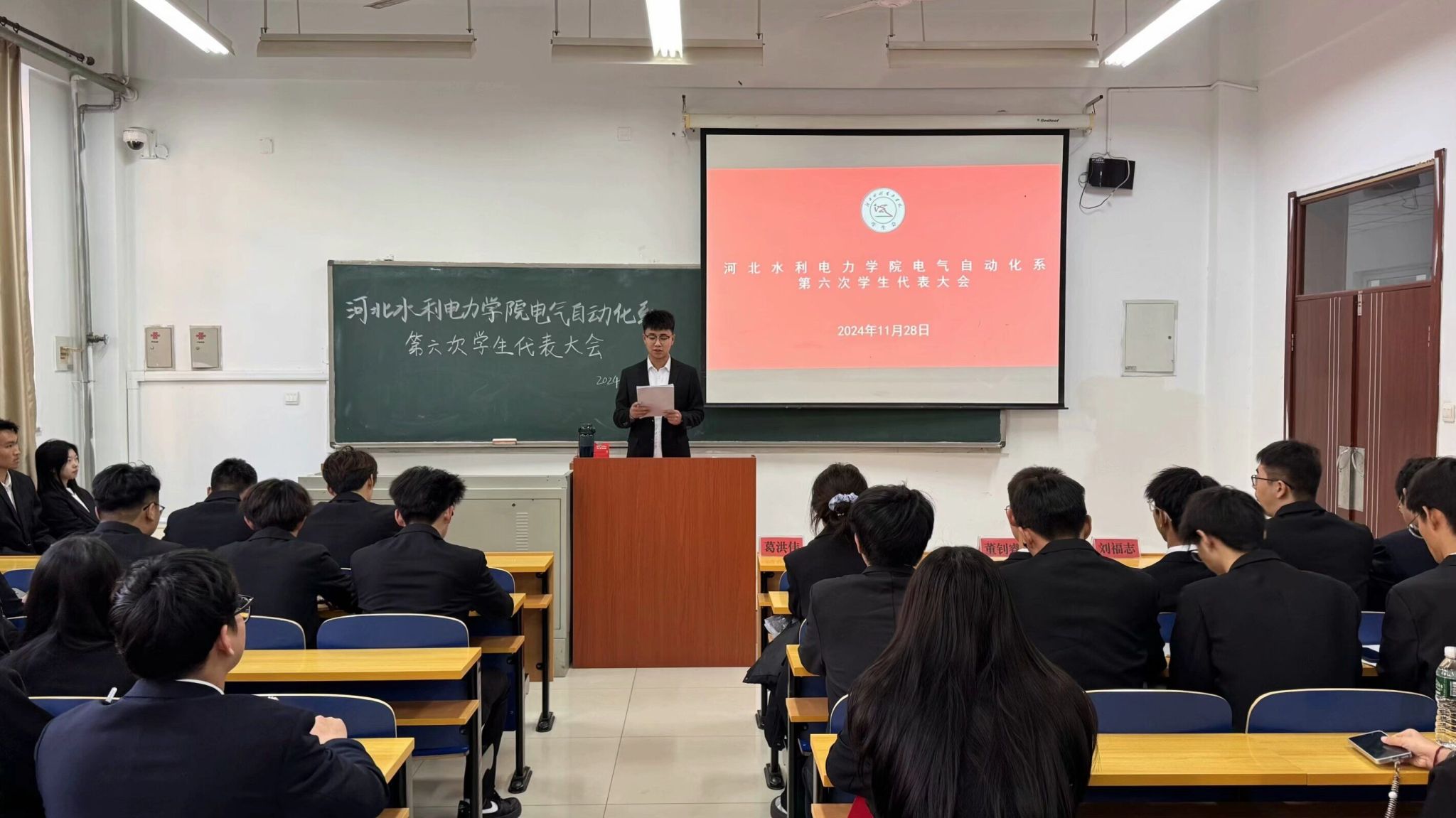 11月28日,电气自动化系第六次学生代表大会在笃行楼A106召开。电气自动化系党总支书记葛洪伟、团委书记张宁、辅导员董钊睿出席会议,全系共计40名学生代表参加会议。